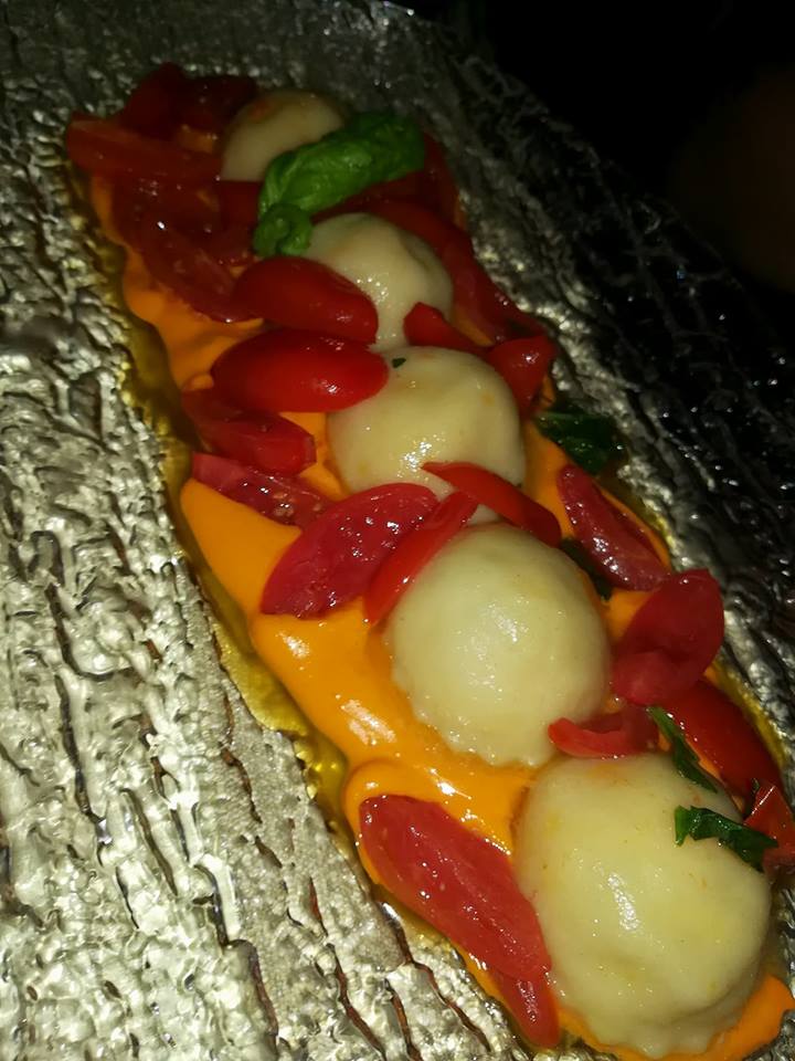 Iniziamo la cena con un benvenuto dello chef, un semplice supplì di riso con piselli su crema di pomodori e basilico.