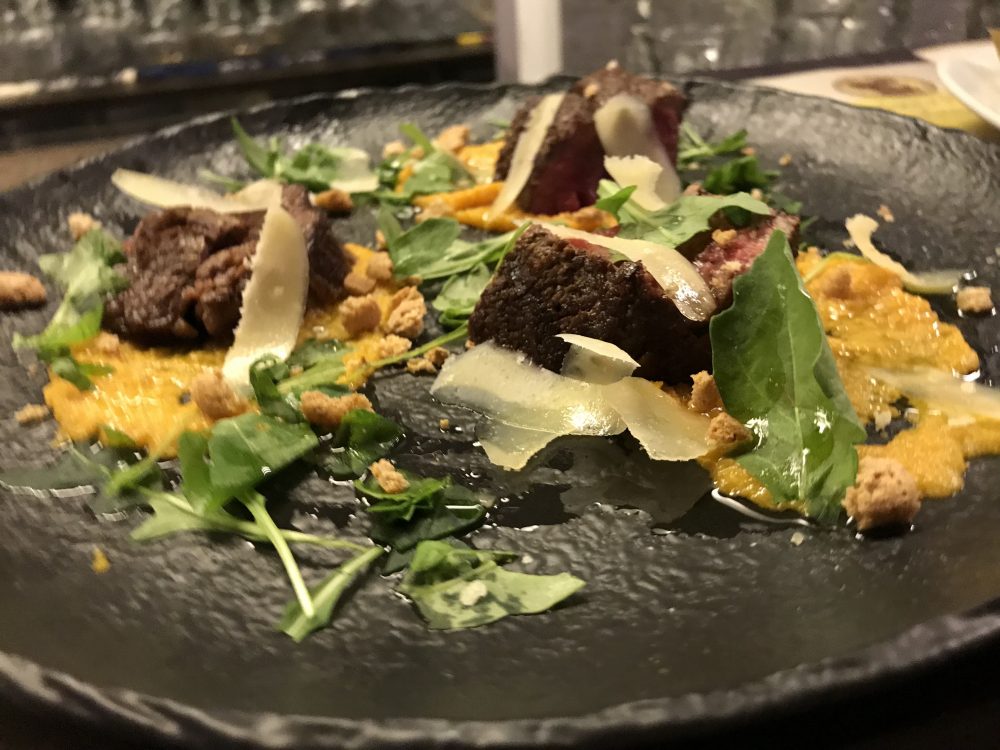 Tra i piatti innovativi suggerisco di provare le sottili e raffinate Slice di Wagyu Kobe, servite con una gradevole crema di zucca al wasabi, rucola selvatica e amaretti sbriciolati.