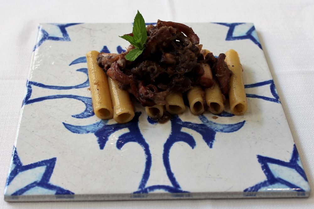 Una pietanza con candele di Gragnano spezzate a mano, genovese di polipetti veraci di scoglio pontino, blend di cipolle fresche dalla Terra di Lavoro (bianche-dorate-rosse).
