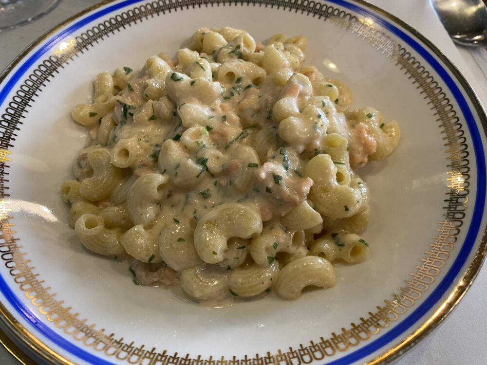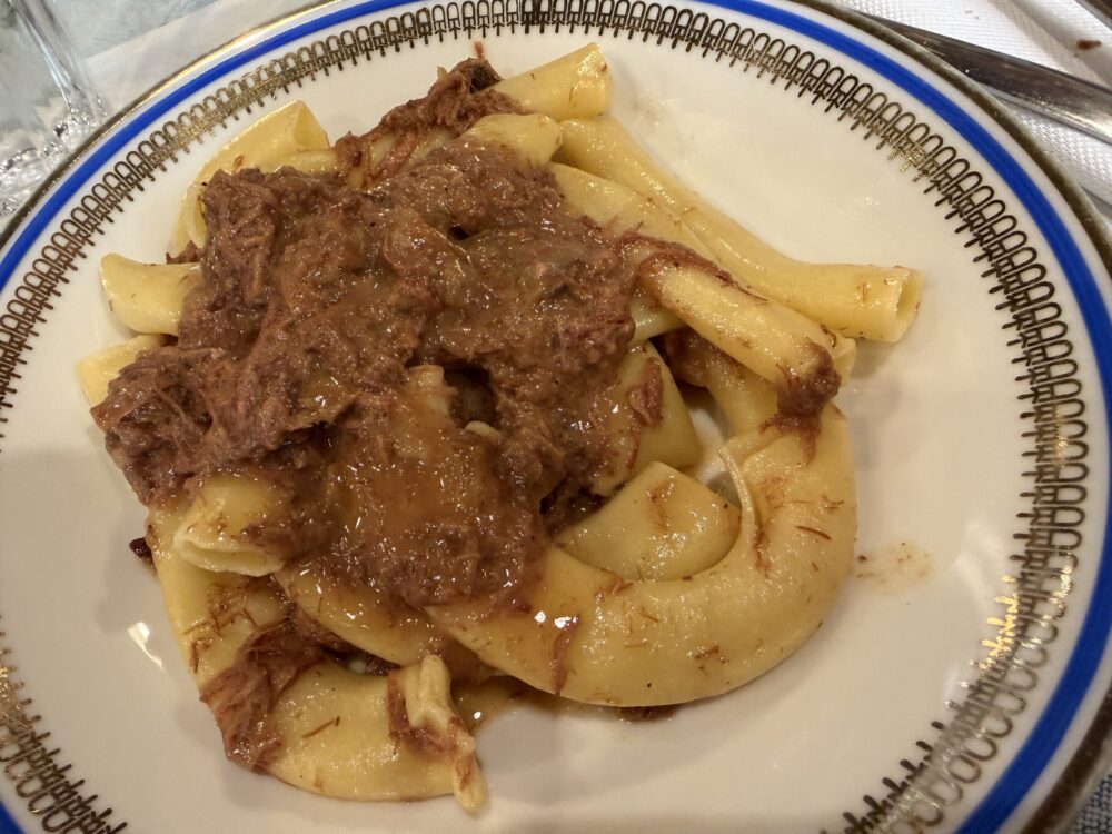 A memoria: lumache alla bourguignonne; tartare di salmone della Val Nure e avocado; piedini e nervetti di vitello; Pici all’Aglione; tortelli burro e salvia; maccheroni al ragù di cortile; ziti fatti in casa alla genovese; manzo all’olio, cotechino artigianale, costata del Cazza(mali) su ordinazione. Qua e là dei divertissement, come estemporanee riedizioni di piatti anni ’80: pennette vodka e salmone, ad esempio. A breve, la sua versione delle tagliatelle Alfredo, piatto italiano che ha trovato successo negli States. Da qui, a Make Alfredo Great Again, è un attimo.
