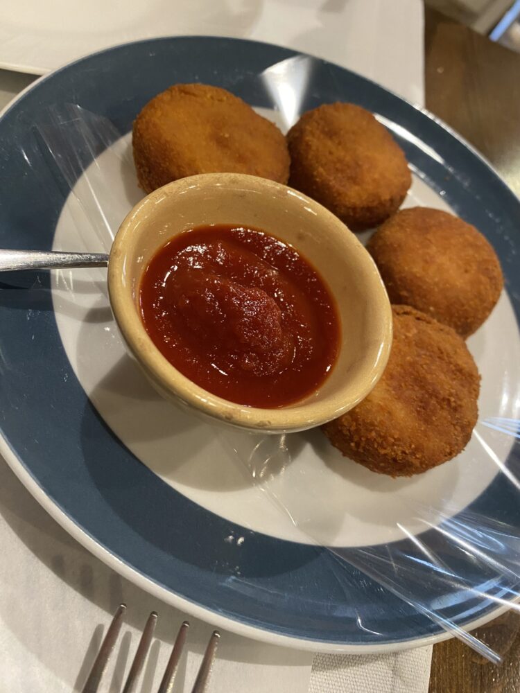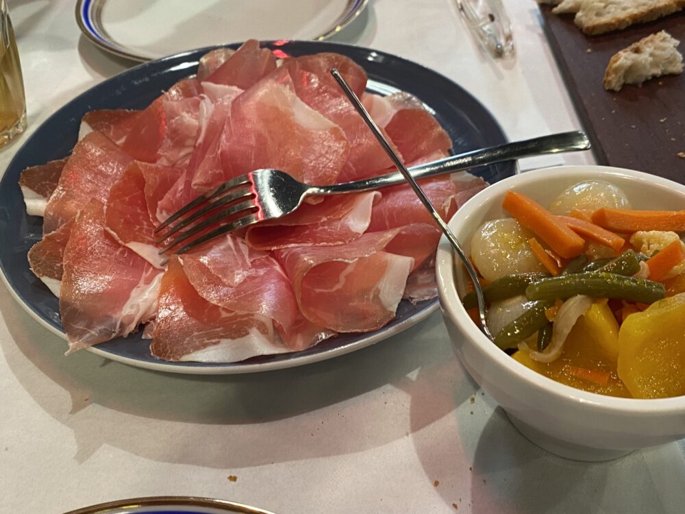 Ci sono state fin da subito le polpette di carne mista con la salsa rubra tipica piemontese, salumi piacentini ed emiliani con la crescentina, tra cui la culaccia di Bettella, la mortadella di Capitelli e il salame di Maini, la giardiniera home made; le acciughe Codesa, qualche verdura, la tartare del Cazzamali, la lingua salmistrata, il giovedì gnocchi e l’onnipresente sbrisolona come dolce.
