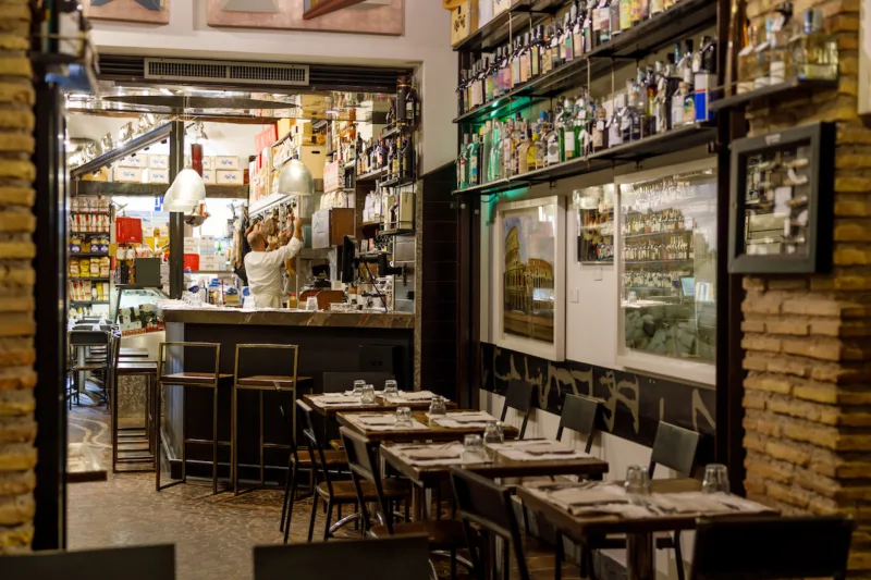 I piatti signature Roscioli, la pizza bianca dell’Antico Forno Roscioli, un bancone all’ingresso dedicato alla gastronomia, un’ampia