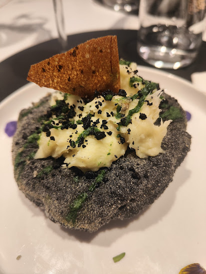 Tra le proposte la Montanarina Nera con quenelle di Brandacujun (piatto tipico ligure a base di stoccafisso e patate), chips di patata, polvere di olive taggiasche e coulis di prezzemolo – un entrée che apre il dialogo tra Liguria e Campania, la Brezza di Sanremo, con vellutata di patata di Pigna e gambero condite con polvere di gambero finocchietto marino – espressione del territorio ligure;