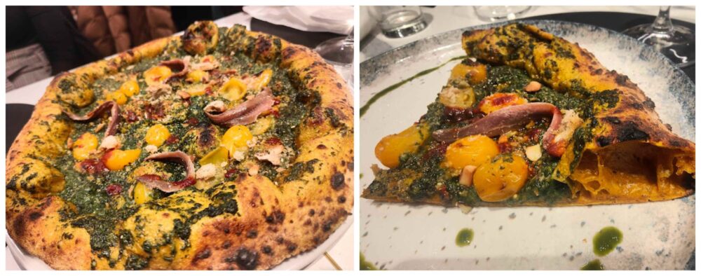 la Maestro Santucci, margherita pizza signature di Salvatore Santucci, Santucci nell’Orto di Senese, un impasto alla canapa con crema di sedano rapa e cavoletti fermentati, gel di melograno e polvere di arancia – un incontro creativo tra ingredienti e stagionalità e la Parteponente con impasto alla curcuma, pesto alla genovese, acciuga e pomodorino giallo del monte Somma con crumble di tarallo. Ciascuno dei due protagonisti terrà ora con sè qualche tecnica o ingrediente dell’altro: Senese è rimasto colpito dagli impasti alla curcuma e alla canapa di Santucci, quest’ultimo dalla consistenza del pesto e all’equilibrio dei topping dell’altro. Una fusione che è un racconto tra due anime complementari del mondo pizza che sicuramente si incontreranno per altri appuntamenti.
