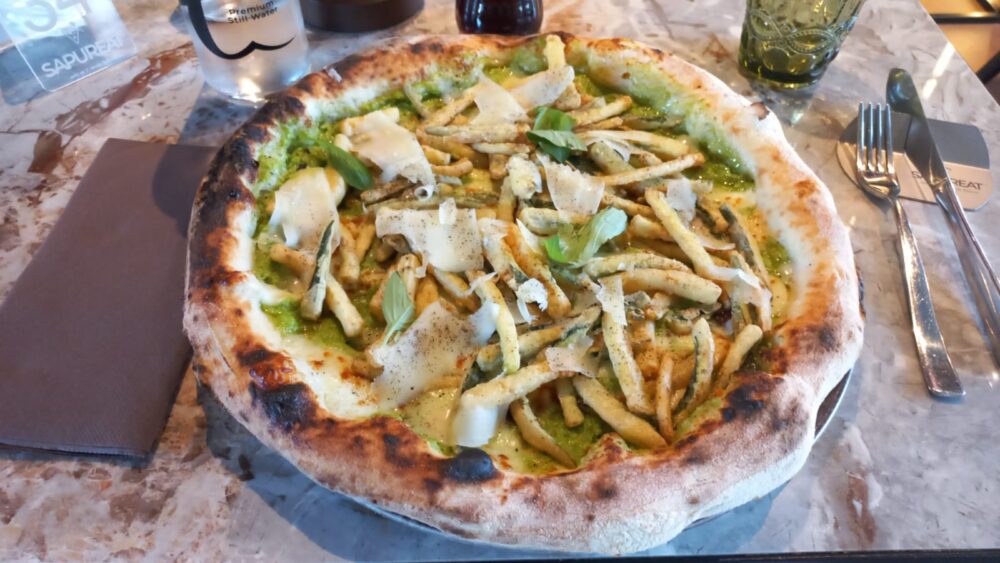 Tra le novità in frittura anche i “Crocchè formato XXL” come lo “Scostumato” (Crocchè di patate 100%, con provola e pepe; in uscita fonduta di provola, salsiccia di maialino nero e bacon croccante, ma anche il “Pulled&Crok” (Crocchè di patate 100% con provola e pepe; in uscita pulled pork selezione D’Alterio e salsa burger). Da non perdere prima di dedicarsi alla scelta della pizza il tris di montanarine (classica/ragù/crema di peperoni e salsiccia). A proposito della regina della tavola da “Sapureat” la proposta “a ruota di carro” riguarda la Margherita e la Marinara ma la stesura a ruota si può chiedere di applicarla a tutte le pizze presenti nel menù.