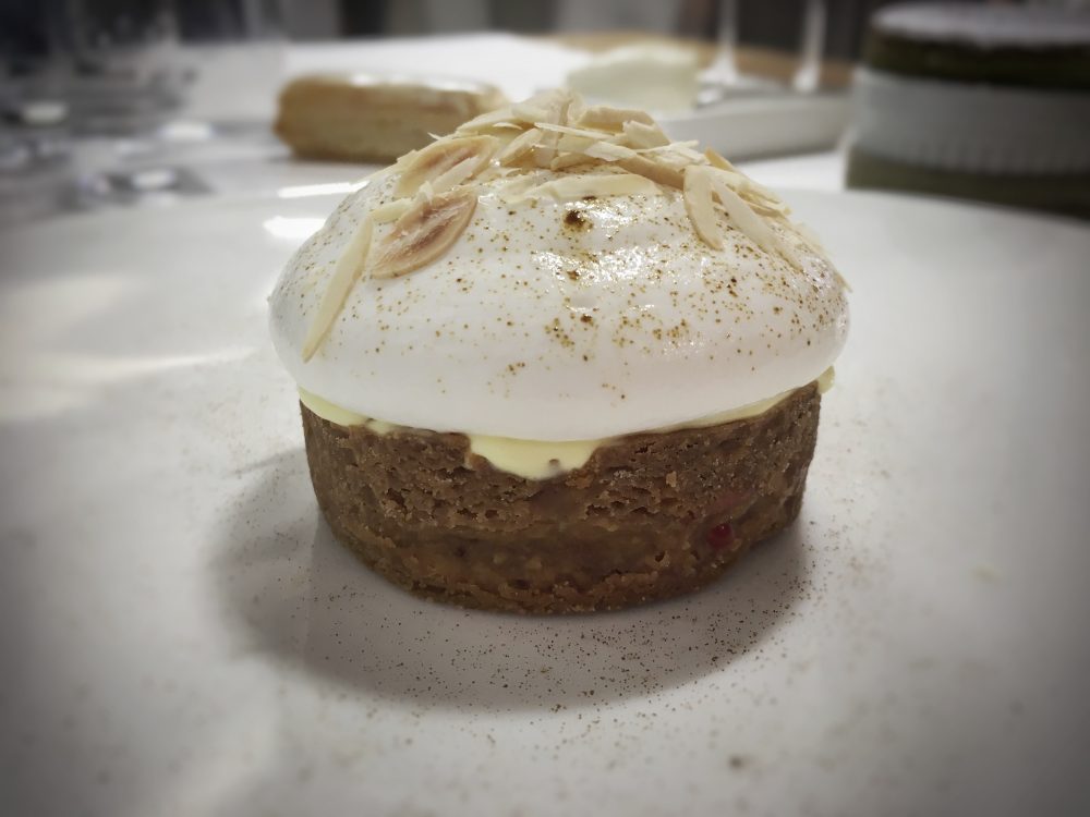 Cristian Torsiello – tartelletta con frolla al caramello bergamotto lampone e spuma di mandorle e liquirizia