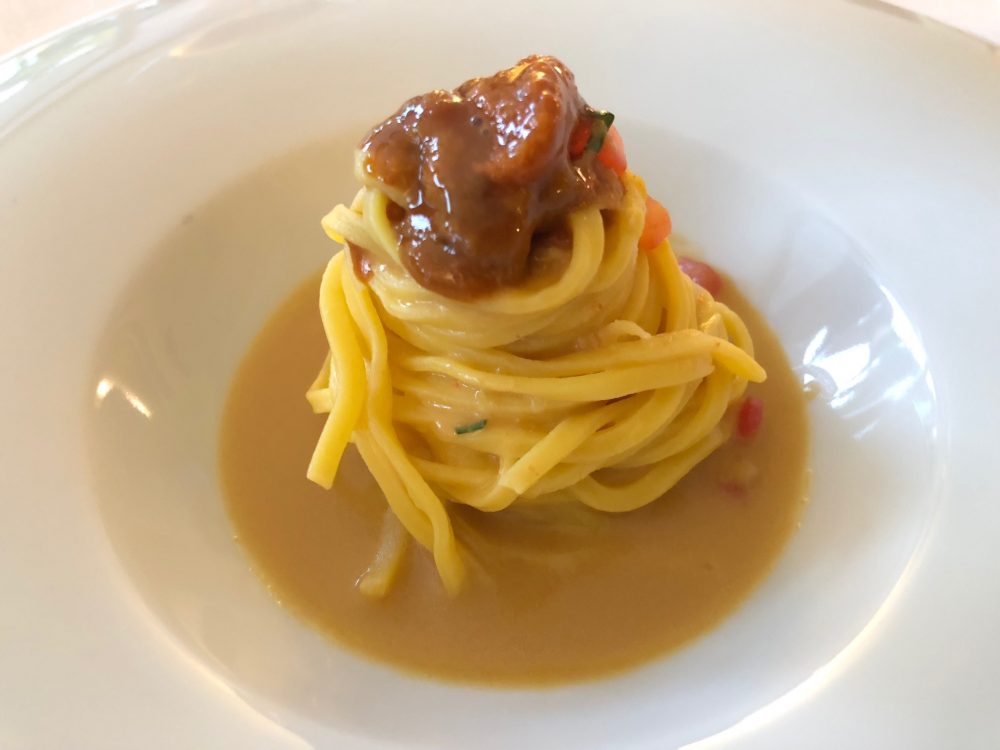 Florian Maison, San Paolo d’Argon, tagliolini 33 tuorli, ricci di mare acqua di pomodoro e limone, forse il limone non è di Sorrento come Umberto De Martino, lo stellato chef di questo bel locale sulle colline bergamasche