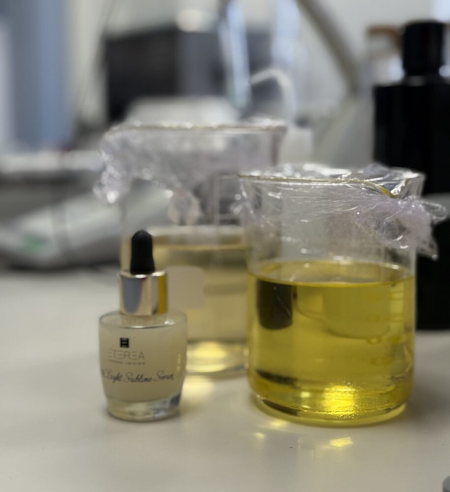 Entrare nel laboratorio di Eterea è come varcare la soglia di una pasticceria silenziosa e luminosa, dove si creano texture che accarezzano la pelle come creme vellutate, e ogni formula è una ricetta custodita con amore. Qui, ogni gesto ha la delicatezza di un pasticciere che dosa grammi d’equilibrio e gocce di bellezza, con rigore scientifico e attenzione artigianale. Gli strumenti sono bilance di precisione e becher trasparenti, capaci di trasformare gli ingredienti della natura in piccole porzioni di benessere.