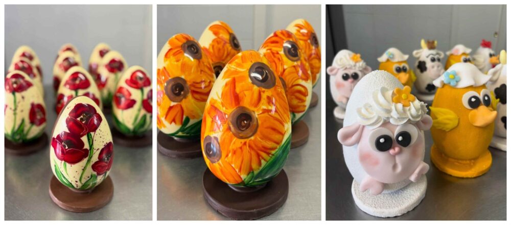 Nella sua bottega che sembra una casetta di pan di zenzero di 25 metri quadrati è un tripudio di dolcezza tra cui spiccano in questo periodo pasquale le pastiere-fiori, che sembrano tante margherite bianche dalla corolla arancione e le uova al coccolato. Divertenti quelle che ritraggono animaletti, dalla tecnica particolare le uova bicolore. “Sono dedicate ai fiori dipinti e realizzate dipingendo in trasparenza con i colori al burro di cacao direttamente nello stampo, precristallizzatiprima di colare il cioccolato del guscio: metà cioccolato bianco e metà cioccolato fondente o al latte, tutti di selezione belga. Ognuno ha la sua unicità, con il piedino realizzato sempre in cioccolato, per un uovo completamente ecosostenibile e dipinto a mano”, conclude Benedetta.
