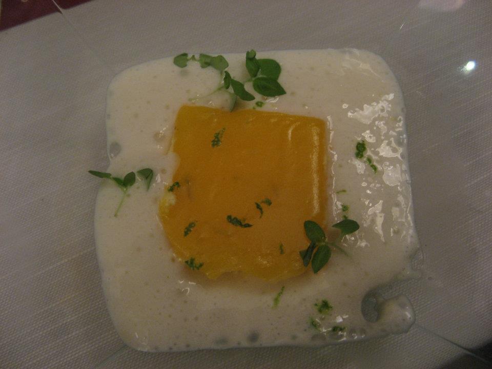 Uros Fakuc del Restavracija Dam (Nova Gorica): aperitivo sull’albero d’ulivo, seppiolina inesistente in infuso di mare, sformatino d’autunno 2011.