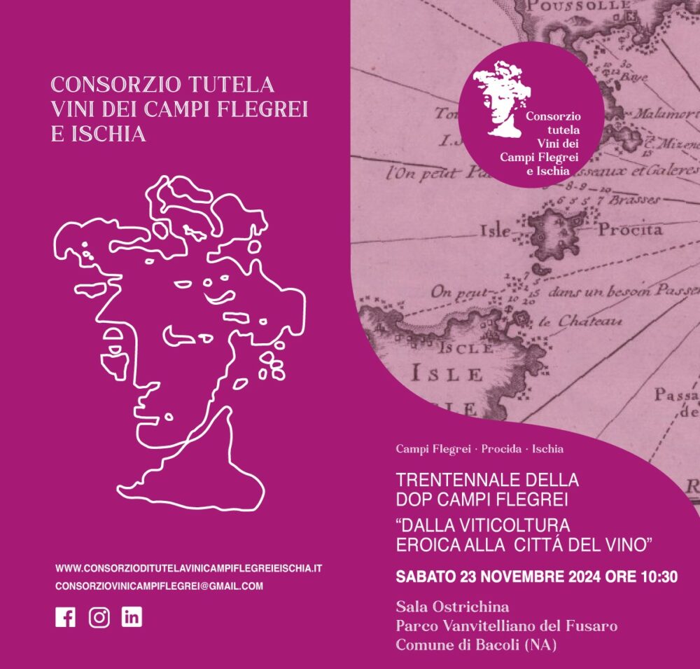 Il Consorzio di Tutela dei Vini dei Campi Flegrei e Ischia presenta il convegno per il trentennale del riconoscimento della DOP per i vini dei Campi Flegrei “Dalla viticoltura eroica alla città del vino” che si terrà sabato 23 novembre 2024, a partire dalle ore 10:30, presso la Sala Ostrichina del Parco Vanvitelliano del Fusaro a Bacoli (NA).