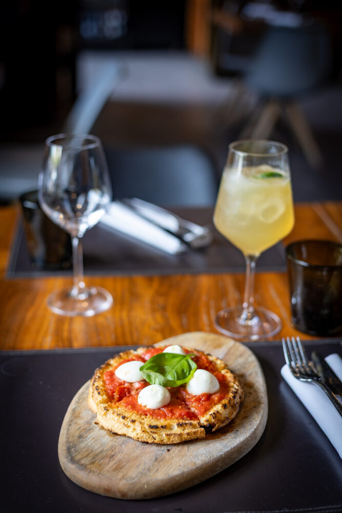 Focaccella con bocconi di bufala, pomodori San Marzano DOP e basilico