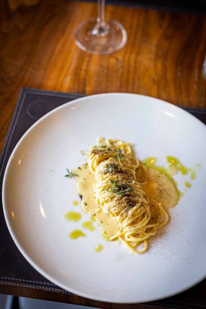 Tagliolino con burro di Normandia, acciughe del Cantabrico e lime nero essiccato, un equilibrio audace e riuscito.