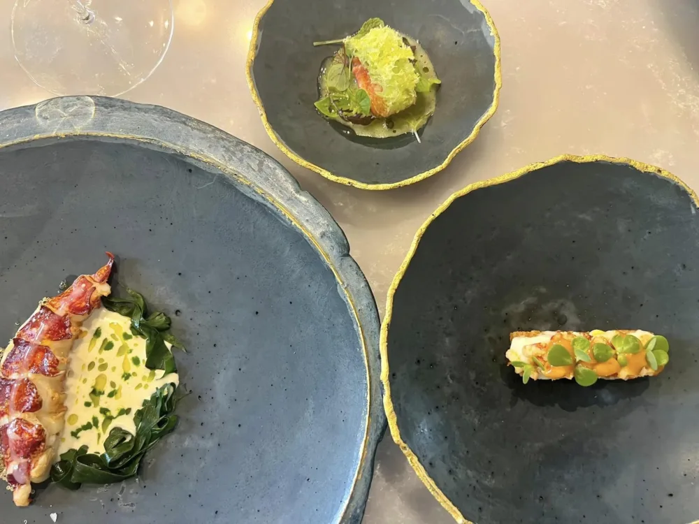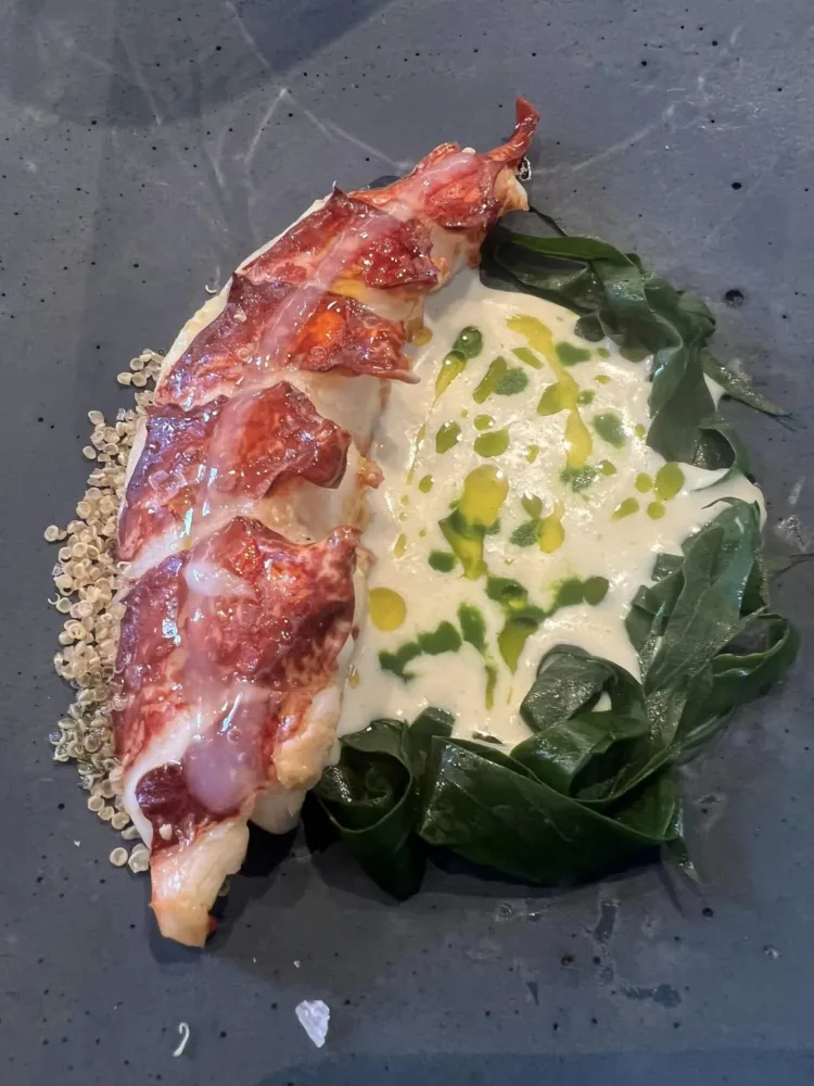 Nel nitore dei sei tavoli del locale ovvero del marmo lucido dello chef table il menu contemporaneo predisposto dallo chef, a cavallo tra “le mille bolle in blu” a base di Dom Perignon e “Viaggiando con Ferrari” (abbinamento enologico scontato, a base di Giulio) dopo l’impeccabile cadenza di amuse bouche che omaggiano Napoli e il Golfo si illumina “astice blu”, un trittico composto da varie parti del crostaceo con una salsa tandoori e yogurt che lo rende un piatto quasi franco-creolo, di rara perfezione.