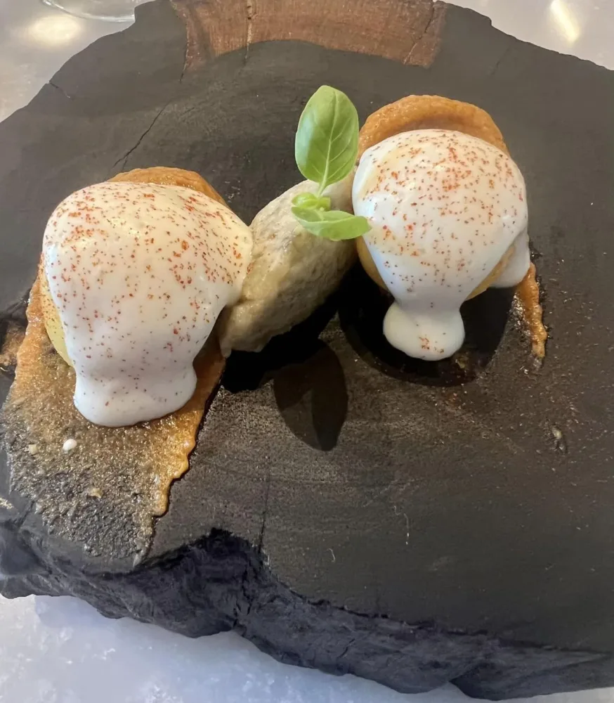 Cvetan Todorov, filosofo e saggista bulgaro naturalizzato francese nel suo romanzo più famoso diceva che la bellezza salverà il mondo. Non so se sarà così, però sicuramente la bellezza aiuta a vivere meglio. La bellezza è il leitmotiv di questo ristorante. Dal meraviglioso giardino, curato e mostrato come si fa con la cosa più preziosa che tieni, alle opere di Lello Esposito sparse in tutto il ristorante. Bellezza nelle presentazioni dei piatti, ogni piatto che sia di porcellana, vetro o legno è disegnato direttamente da Nino, sono fatti apposta per lui. Bellezza nel proporre il piatto più tipico di Ischia, il famoso coniglio, in una versione elegante, racchiuso in un raviolo, con una pasta tenace che amplifica le sensazioni. La bellezza di essere legato alla propria terra, di non aver paura di raccontare che la Campania e l’isola di Ischia sono luoghi magici, che tutto il mondo ci invidia. Bellezza come guardare uno scorcio di Ischia Ponte e rimanerne tanto colpito da immortalare quel momento e quello scorcio in dolce. A Ischia Ponte c’è il bar dove prende il caffè, c’è il signore che vende la frutta, una salumeria che fa un panino con la mortadella strepitoso, i bambini che giocano al pallone. Tutto questo l’ha racchiuso in dolce.