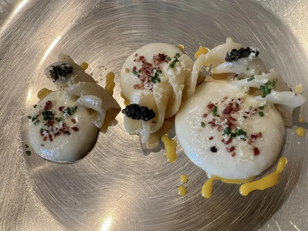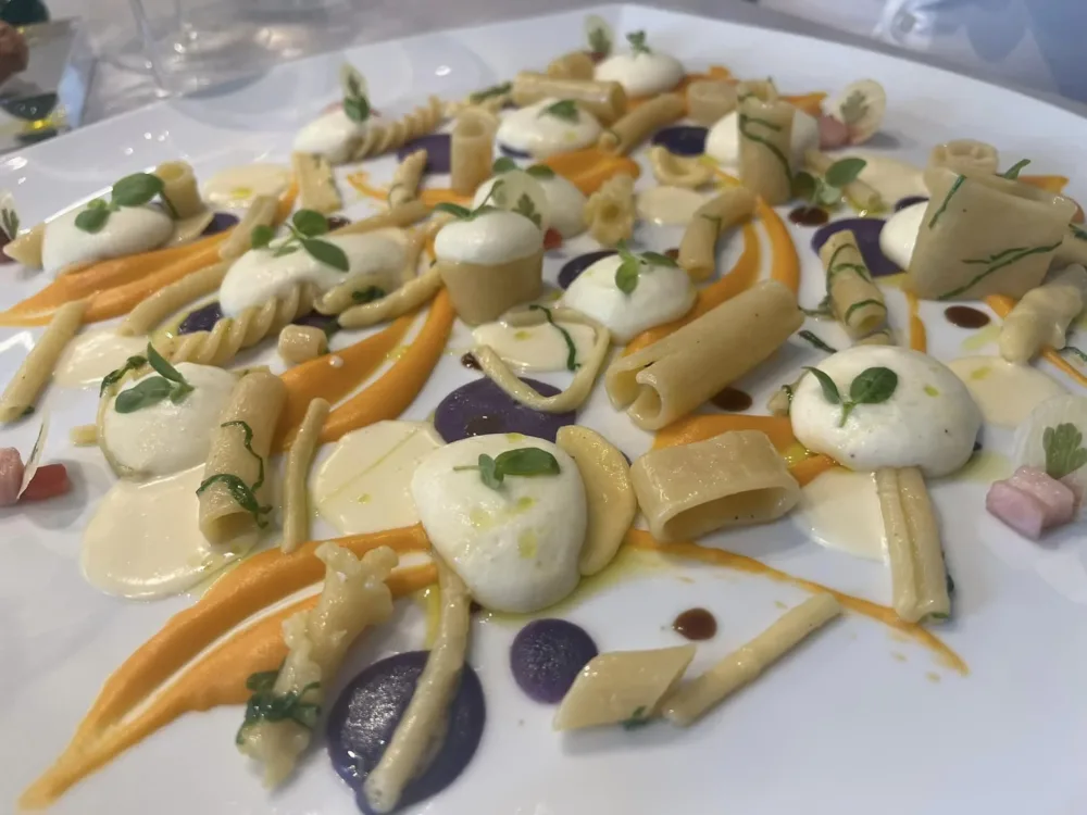 Abbiamo dunque il riso con la mozzarela, il limone e i capperi per la territorialità, farfalle e salmone per la memoria autoironica, la carbonara e gli gnocchi per i ghiottoni fino alla colossale pasta e patate con sei tipi di tuberi e 36 formati di pasta, un piatto di cui non potrà mai più liberarsi.