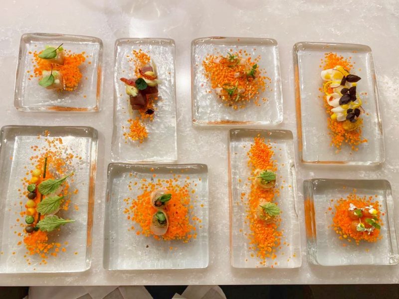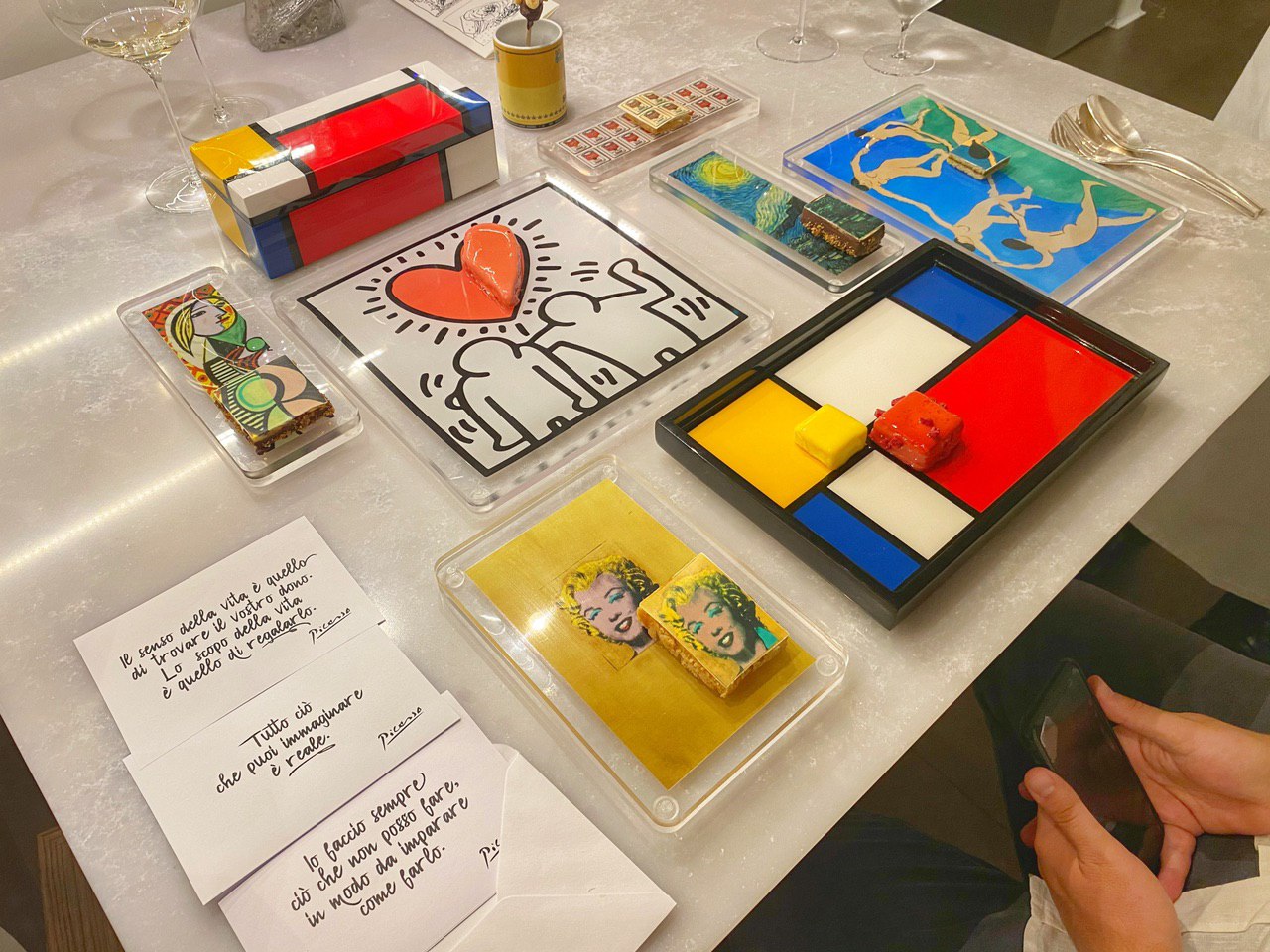 Tutte le corse, così come ogni singolo assaggio dell’aperitivo e degli antipasti sono serviti in piatti unici disegnati dallo chef e realizzati in maniera artigianale.