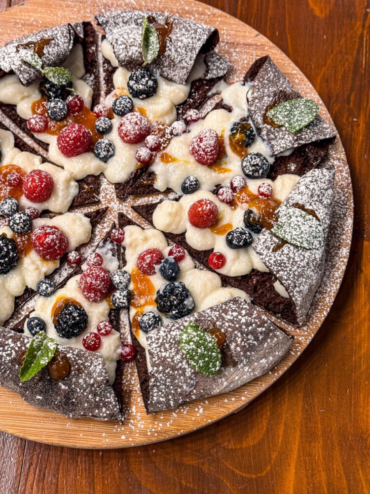 Innamorarsi sul Vesuvio, preparata con impasto al cacao e guarnita con crema al burro, frutti di bosco, confettura di albicocche vesuviane e menta è di una bontà indescrivibile, il dessert perfetto.