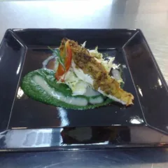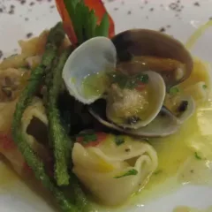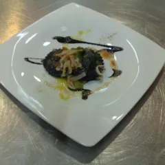 Raviolo al nero di seppia ripieno di mantecato di merluzzo con fave, bottarga e olio al limone 24 Giugno 2010 0 commenti