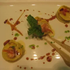 Tortelli di pasta fresca farciti di mozzarella di bufala, coulis di melanzane, gamberi rossi, pomodori confit e zeste di arance caramellate 6 Novembre 2010 0 commenti