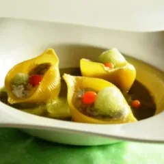 le strade della mozzarella Conchiglioni ripieni di mozzarella di bufala e alici marinate sottovuoto al profumo di tè kukicha, caviale di arancia rossa, pesto di indivia riccia e aria di basilico| Contest Le Strade della Mozzarella Mozzarella