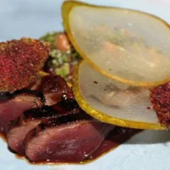 Rachele Sales, Tortino di grano con olive nere Tortino di grano con olive nere, pomodorini confit al timo e petali di baccalà Baccalà