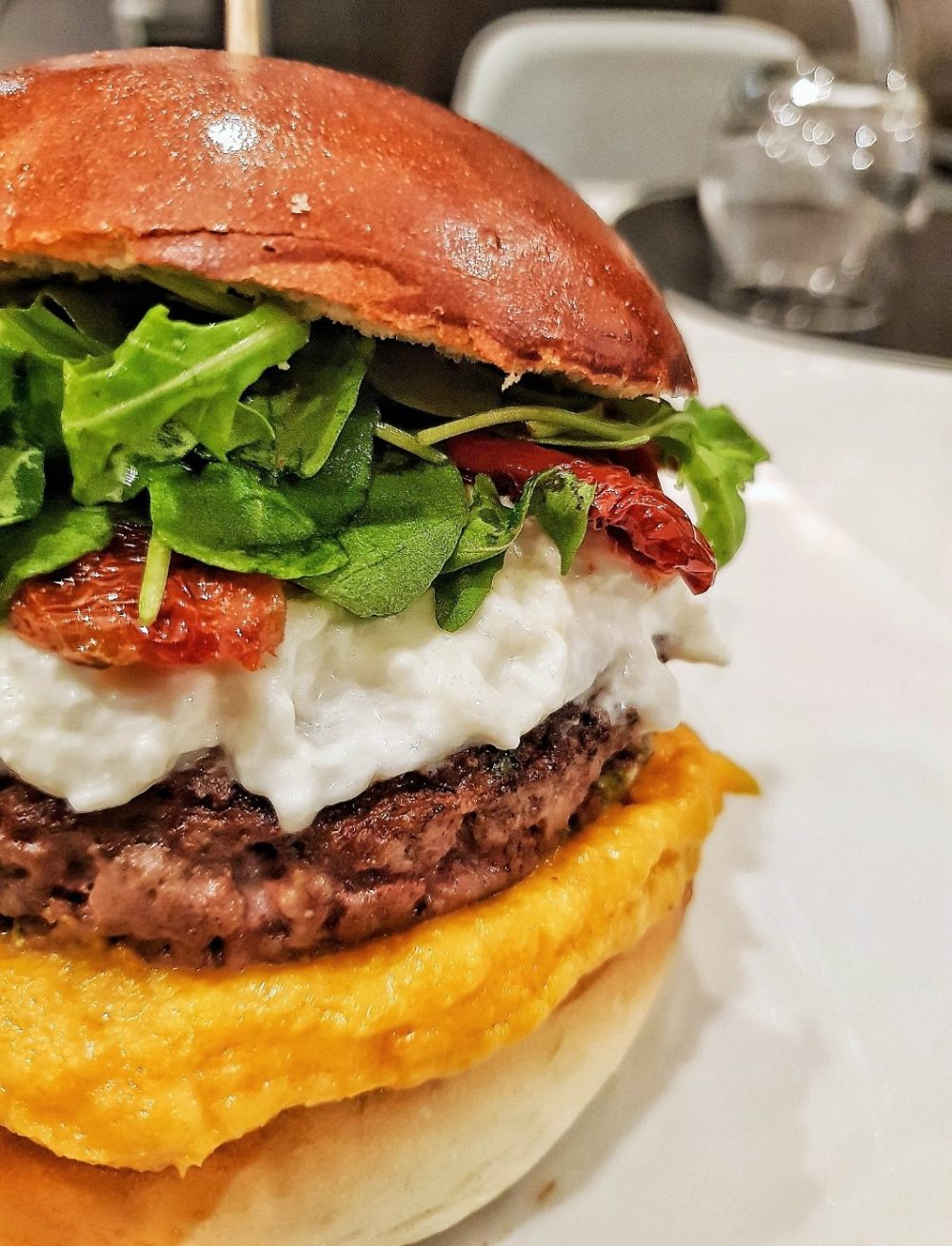 Dattolo Burger House -Zuccatella- hamburger, zucca, stracciata di bufala, pomodoro secco e rucola