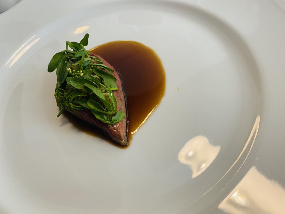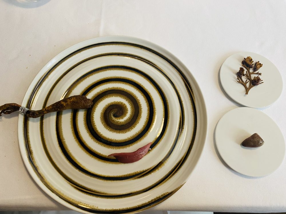 L’ouverture è affidata a una piccola icona, assai forte nell’immagine, la panna cotta ai ricci di mare con spuma di cervello di vitello e polvere di capperi, quasi “uliassico” nell’incontro tra il salmastro e il selvatico, sorprendente per la fusione di elementi morbidi, senza il croccante che va tanto di moda.