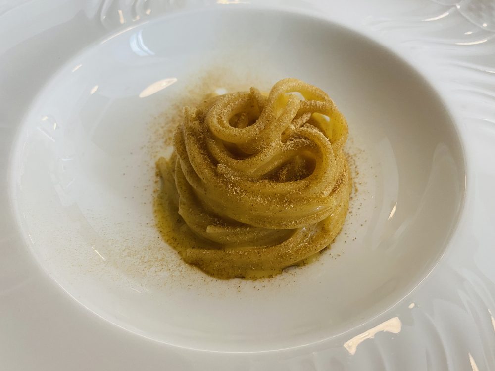 Anche Caranchini, come molti altri illustri colleghi, reinterpreta la cucina di casa, la sua colatura di alici parla il verbo del “garum” di agone e amchoor, polvere di mango acerbo essiccato, che prima di sedermi qui –confesso-non avevo mai sentito nominare, tanto per far capire agli scettici e agli asettici che la cucina è anche cultura, amplia gli orizzonti della mente oltre che quelli papillari. E qui ce ne sarebbe da dire, perché un trentenne che fa il garum con i pesce di lago e lo corregge con il mango acerbo chissà cosa riuscirà a fare tra cinque anni.