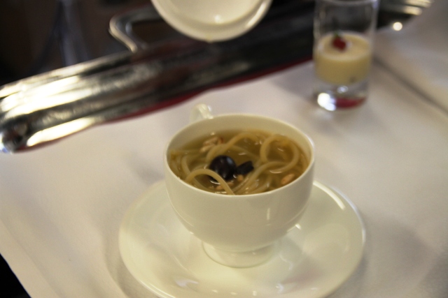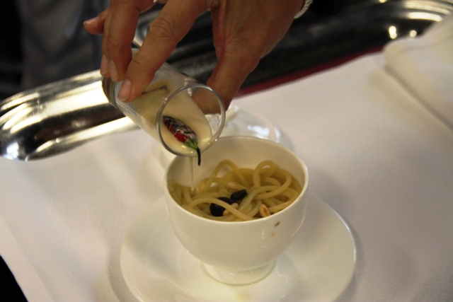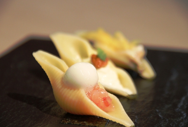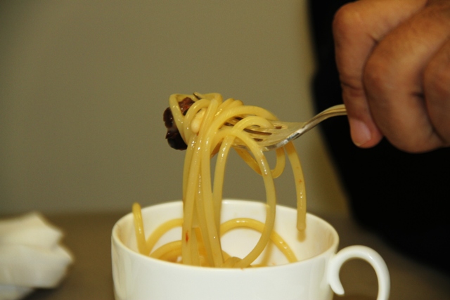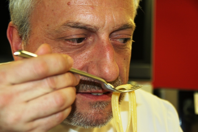 Acchiappante. Molto. Sembra di capire una collocazione della pasta come ingrediente a tutto pasto, con una sottolineatura del senso tattile, sia con le mani che con la bocca. Arrivare all’essenza comporta pochi condimenti, piuttosto abbinanamenti, o forse nessuno, fino alla cottura nuda e cruda. Qualcosa si è già visto, penso Cracco con le resine, Lopriore e gli elicoidali cacio e pepe, Donati con le ruote pazze e crudo di tonno, Di Costanzo coi venti formati: è un modo di stimolare la memoria e il gusto, scavando fin dove possibile, quasi in purezza. Assolutismi . E la pasta, in Italia, è la macchina del tempo più efficace per muoversi tra passato e futuro.