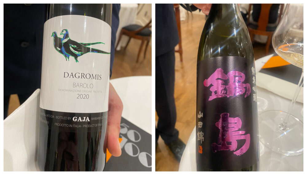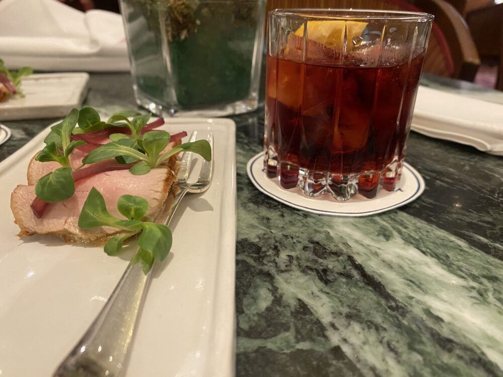 Percorso di abbinamento al bicchiere di assoluto livello, tra Champagne rosè, Bourgogne rouge, Bordeaux Blanc, il Fiano di Luigi Maffini (a mia richiesta) e i cocktail tradizionali apprestati dal barman “d’altri tempi” Beppe Loi.