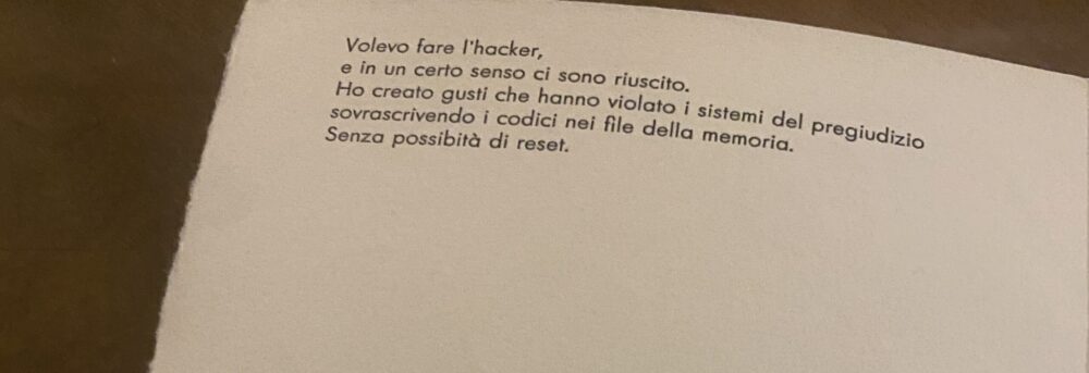 Un tizio strambo che voleva fare l’hacker e non il cuoco il quale –dicebant- pareva stravolgere tutte le regole precostituite della cucina italiana, uno che inventava pasticche di sale, pomodori definitivi, uova cibernetiche e, last but not least, viveva di notte in una maniera che sarebbe stata poco cara al vostro parroco, un po’ come il se stesso del vecchio, caro Bukowski.