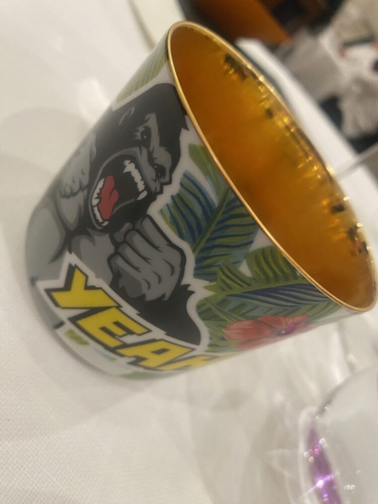 La quale, per tornare al menu, come sempre declinato secondo la regola dell’up-and-down (dal piatto più pesante e proteico a quello più leggero, sempre per la famosa identità da bastian-contrario) per la sola fassona al camino vale il (costoso ma non caro) prezzo del biglietto nonché il viaggio, perché è probabilmente il più grande piatto di carne alle nostre latitudini degli ultimi trent’anni; il rognone al gin ci sta appena appena sotto ma nel suo essere demodè ha tutte le carte in regola per essere un classico, con una salsa semplicemente stupefacente (nota ludica: stavolta sapeva davvero di gin, forse non era finito nelle tisane del retrobottega), poi a un certo punto è giunto un brodo di fassona in una tazza con un gorilla disegnato (..) e un altro brodo più freddo per giocare con le temperature e allora lì capisci che l’indubitabile grandezza di Scabin è nella capacità di giungere all’essenza della materia, non nei giochetti di prestigio dei contenitori e delle consistenze.