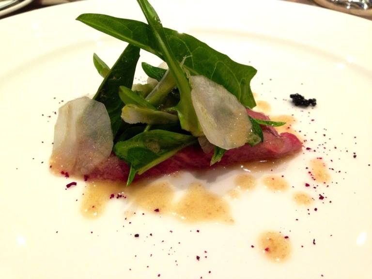 Come guarda al territorio anche la giardiniera brusca, dove Scabin esalta una ad una le singole componenti vegetali (rapa rossa, broccoletto, patata, radicchio…) e piazza sornione il colpo del k.o. con la salsa brusca piemontese a base di uova sode, aceto e senape, ancora una volta nascosta al di sotto come una golosa sorpresa. Altrove, si cerca – trovandolo – un ardito punto di incontro tra Oriente e Occidente (il raviolo fritto di nervetti in brodo di Jamón Ibérico de Bellota e ostriche), o tra cielo e mare (lo spiedino di quaglia e dentice, con un roll di cetriolo, spinaci e wasabi a rinfrescare e sgrassare).