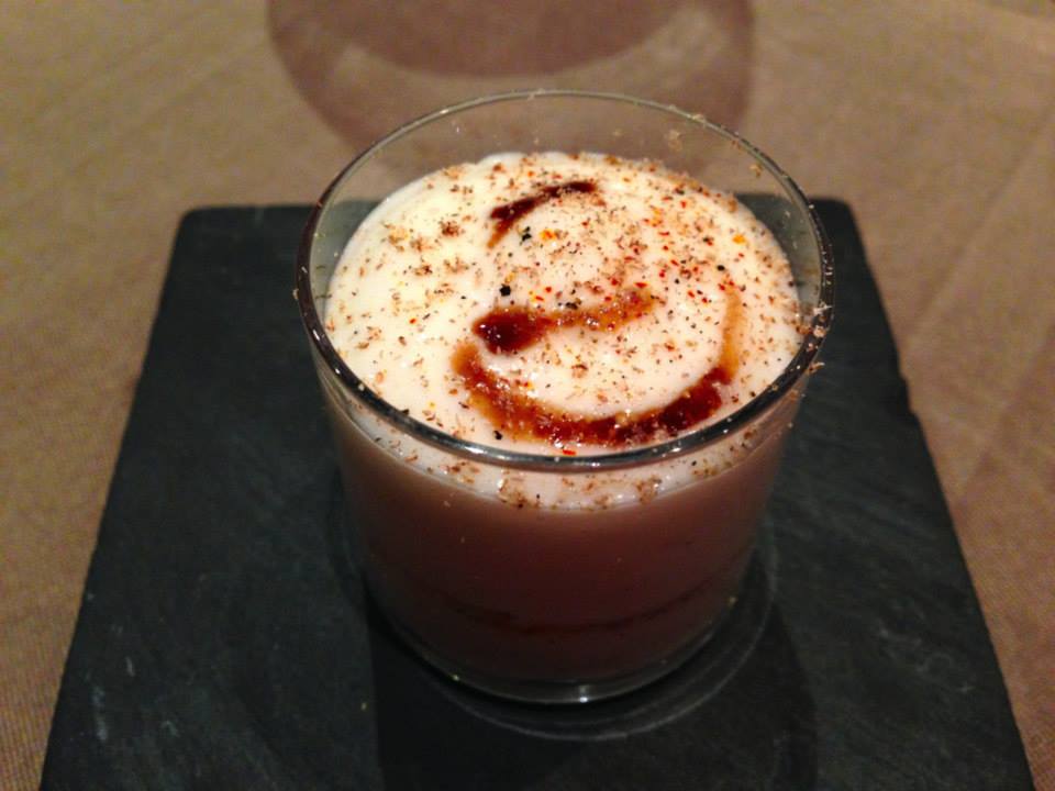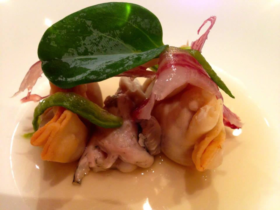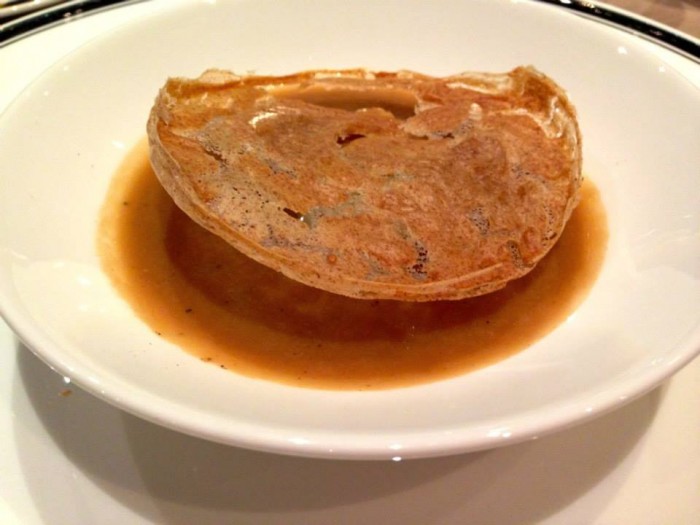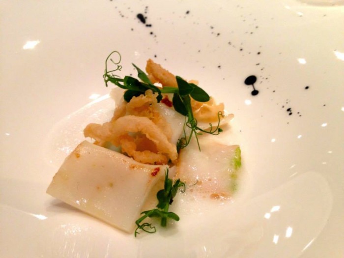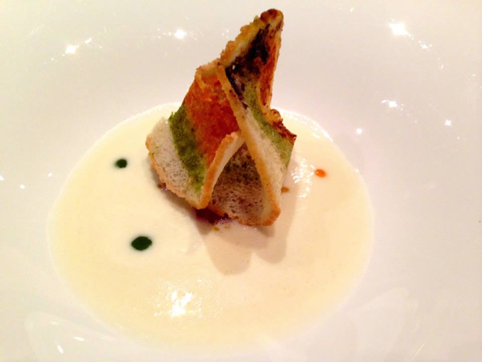 Ma fortunatamente, nonostante i furori avanguardistici che lo accompagnano fin dagli esordi – anche Scabin si è cimentato col Vietnam: ricordate il piatto-installazione Charlie, con le lattine di Coca-Cola tagliate a metà a simulare bare, riempite di hamburger, cosce di quaglia e patatine? – Scabin ha raggiunto una maturità caratterizzata da un equilibrio profondamente materico, concreto. Lo si vede già dal benvenuto, una crema di cipolle con baccalà e cialda al farro: spiazzante, per chi si attenda divertimenti leziosi e pirotecnici, nuove creazioni di food design. Ingredienti poco nobili, da arte povera, per un risultato finissimo nella concezione e convincente nel sapore.