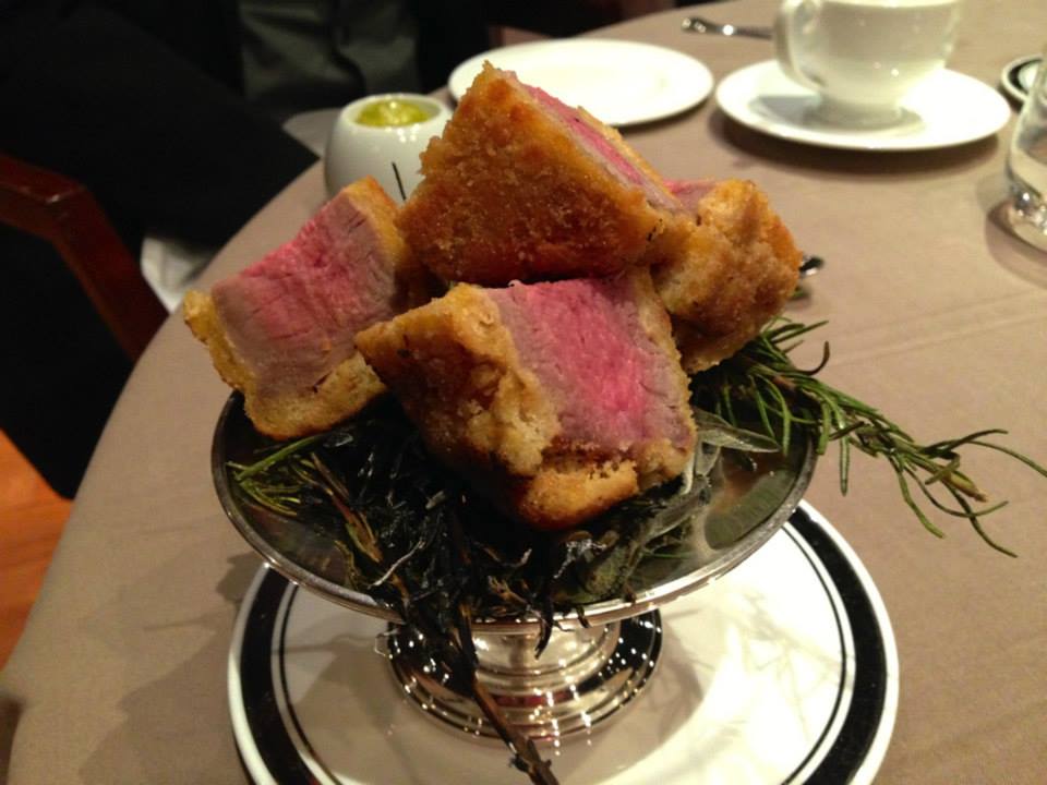 Schiumine o pappette? Non pervenute. Brodini, sì, ma in accompagnamento a una fassona al camino non meno che sontuosa, dove la concentrazione gustativa è tale che il solo profumo è in grado di scatenare salivazioni pavloviane a distanza. Rosa al centro, impanata nel grissino, da mangiare con le mani, magari intingendola in una lussuriosa maionese al wasabi, o alternandola a una purea di patate ratte, per poi concludere col summenzionato brodino. Un piatto che vale il viaggio, e la più schiacciante confutazione al tormentone del “mi sono alzato da tavola con la fame” che dai tempi di Bonvesin della Riva perseguita l’incauto ristoratore sul cammino della creatività.