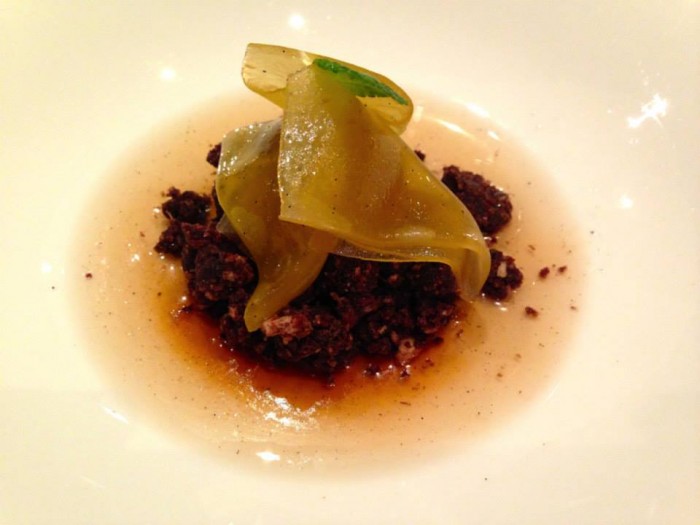 Altro classico in divenire: riso, ceviche e bisque. Un piatto nato zoppicante, e ritoccato con pazienza, fino all’attuale, definitiva (?) eccellenza. Dove la curiosa presentazione in verticale, con il risotto a mo’ di torretta cilindrica sormontata da una friabile cialda speziata, e alla cui base riposa una ceviche di scampi, è una costruzione tanto scenografica quanto effimera, destinata alla distruzione ancor prima dell’assaggio, con l’aggiunta dell’irruenta, concentratissima bisque di crostacei e l’esortazione del cameriere a sbriciolare, distruggere, mescolare e solo dopo assaporare. Come un castello di sabbia da demolire alla prima risacca di marea. Boccone dopo boccone, un piatto entusiasmante.