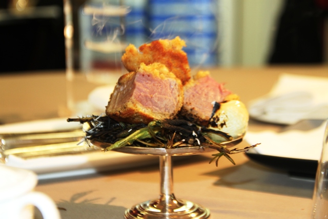 Venendo alla sostanza, e cioè a Scabin, che dire se non che ci ha fatto passare un’ora (abbondante) di assoluta delizia, alternando con sapienza piatti più creativi (che ci sono piaciuti, con solo una riserva sui gamberi all’occhio di bue, con i gamberi un po’ defilati nel contesto della ricetta) a piatti della memoria (che ci sono piaciuti ancora di più), come ad esempio il tonno di coniglio, il rognone, la carne alla griglia. E qui è la vera bravura, perché stupire con l’effetto speciale è facile, superare la bontà assoluta dei codici di riferimento del palato lo è ancora di più.