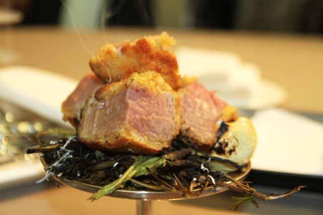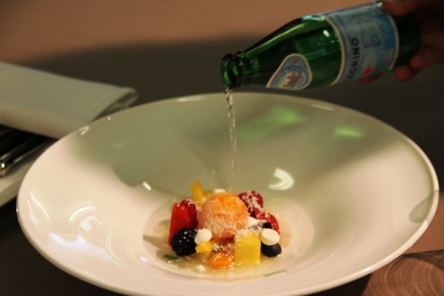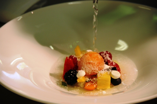 Il sogno di ogni gourmet è di avere il cuoco che cucina solo per lui. Il nostro sogno si è realizzato quando, in occasione della presentazione di un prodotto particolare (lo spaghettone di Felicetti), l’aereo ci ha fatto arrivare con largo anticipo nel posto convenuto: il Combalzero di Scabin. E visto che il gruppo degli altri giornalisti provenienti da Milano era in ritardo, Davide Scabin ha pensato bene di intrattenerci non con le chiacchiere, ma con i fatti, cioè le sue ricette.