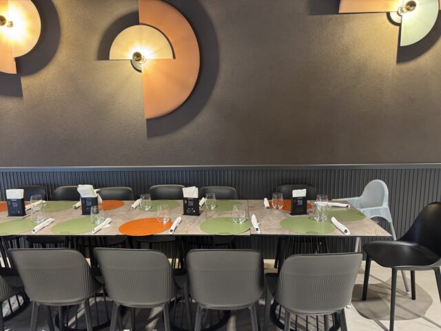 Il nuovo spazio si veste di modernità e design: sedie comode, divano, bancone bar, doppia vetrina del forno in sala, mensola e sgabelli pensati per un “tu per tu” con Vittorio, dedicato alla futura degustazione. I colori caldi dell’arancio e del grigio scuro si mescolano a tocchi vivaci come il verde mela delle tovagliette, che dona freschezza e allegria all’ambiente.