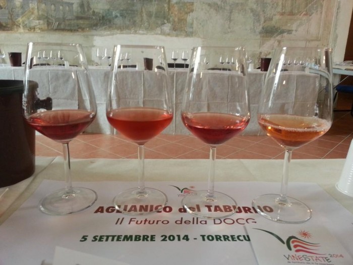 il rosato da uve Aglianico (del Taburno) non è cosa semplice da ottenere, iniziando dal lavoro in vigna sino a quello che lo separa dalla bottiglia. Trovando derivazione da uve naturalmente cariche di antociani, (come quelle del Negroamaro, del Primitivo o del Montepulciano) possenti e cariche di acidità, il colore non può non “risentirne” e risultare visivamente più ricco. Un Natural- testimonial verrebbe da dire! Un vitigno che parla la lingua (colore) della sua terra! Ma ogni medaglia ha il suo rovescio. Vero anche che il mercato, o il consumatore medio, è legato ad un’idea di rosato dal colore tenue, di facile beva, delicato e non eccessivamente strutturato. Come si fa, se l’Aglianico del Taburno nasce forte e carico di estratto? Come intrecciare i due fattori? Una cosa è certa. Mai snaturare un vitigno per andare incontro alle esigenze troppo labili del mercato, e mai dare l’impressione di produrre un “rosso scarico” piuttosto che un (vero) rosato tout court! Un opzione possibile potrebbe essere arricchire di rigore il disciplinare, attraverso un dettagliata tipizzazione sul colore. Ad oggi, purtroppo, non esiste una precisa e dettagliata tipicità di colore del rosato, giacchè dipende dalla scelta/ gusto del produttore e dalla durata del contatto delle bucce con il mosto. Il mercato si trova così ad avere una vasta gamma di nuance a disposizione che di certo non concorrono a giovare all’immagine unica di rosato. Occorre che ci si muova tutti verso un progetto comune e specifico che abbia come obiettivo la versione Rosato. Tirando le fila di questa batteria una cosa è certa: il punto di forza e fil rouge comune, è l’assenza di versioni piacioni e ruffiane, old stile! Calici piacevoli, caratterizzati da una grande freschezza e acidità. Elemento questo non facile da riscontrare in tema di rosati. Campioni diversi, gradevoli e mai banali!
