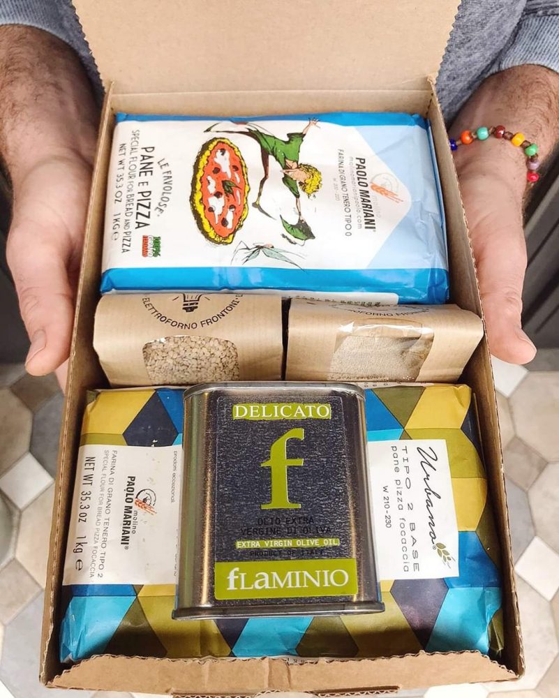 Bella domanda, io sto vivendo un’esperienza nuova, mi sono messa in gioco non tanto con la mia professione perché il mio olio, l’olio Flaminio, non lo vendo ai privati. Questa scelta è a monte, la feci tanti anni fa quando iniziai la produzione e decisi di vendere solo alla ristorazione. Oggi con questa crisi, che ahimè riguarda soprattutto i ristoranti, noi produttori siamo i primi a pagarne le conseguenze con consegne effettuate e fatture datate 2019 e non ancora pagate, richieste fatte al vento e difficoltà che sembra che non ci riguardino mentre invece sono il nostro problema quotidiano. Non vendo per conto della mia azienda però l’olio Flaminio è stato inserito in un’iniziativa promossa da uno dei venditori che fa parte della community, Elettroforno Frontoni, che insieme a Davvero Distribuzione hanno ideato una Home Box contenente il necessario per fare a casa pane e pizza. Il box contiene: la ricetta, la farina, una lattina di olio, un sacchetto di sesamo e il lievito per panificare. Una grande idea di co-marketing che dimostra come l’unione fa la forza!