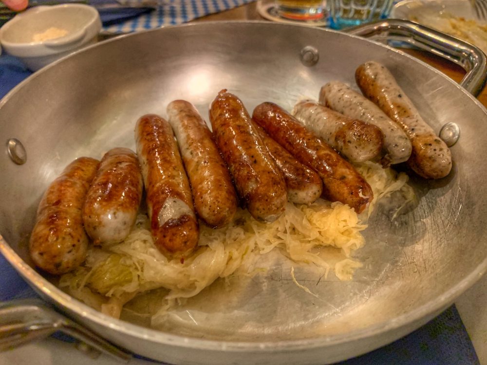 Divertenti e invitanti sono le salsicce di Norimberga IGP, servite con crauti bianchi bavaresi affumicati, insalata di patate bavarese, senape e rafano. Un gusto particolare, molto speziato. Cottura buona che lascia la giusta succosità alla carne.