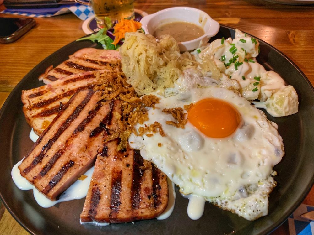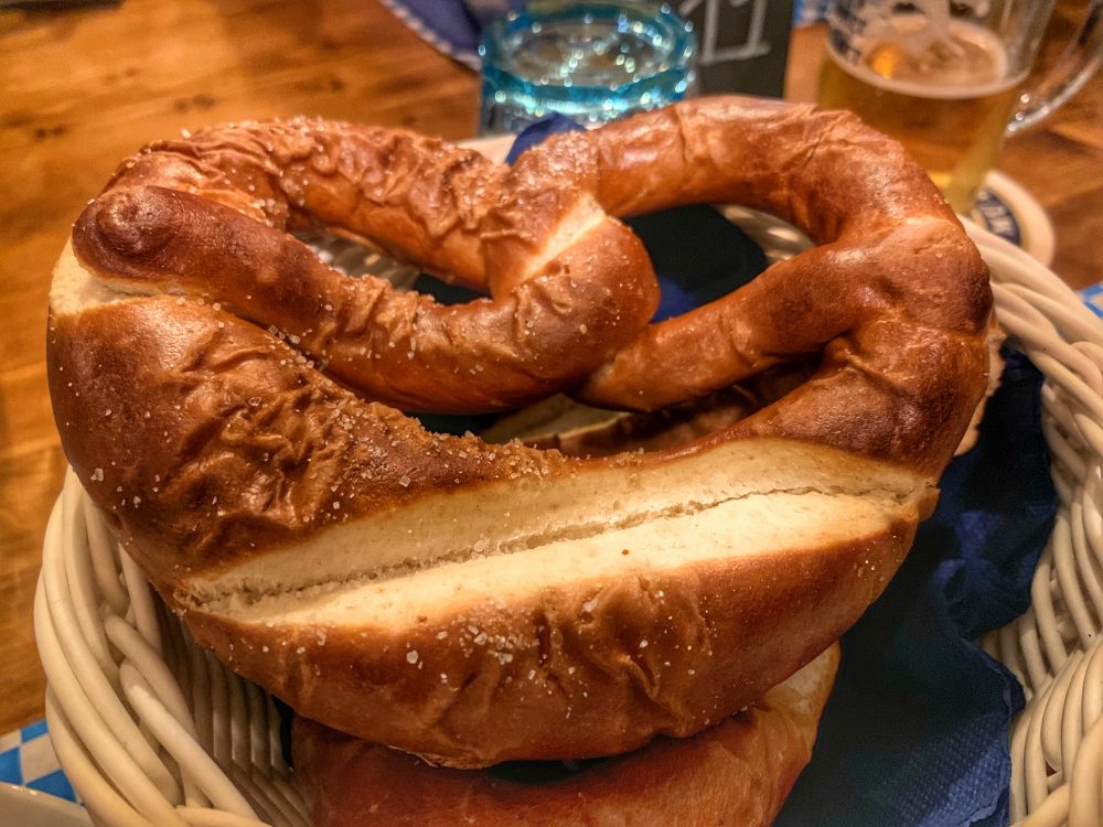 Fra i piatti completi troviamo la grigliata mista di würstel. Ma anche il Leberkäse, ovvero carne di maiale tipica della Baviera servita con uovo al tegamino, cipolla croccante, crauti affumicati, insalata di patate bavarese e salsa Der-Pschorr. Consiglio di ordinare i Bretzel da accompagnamento.