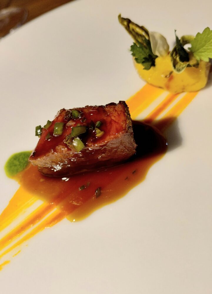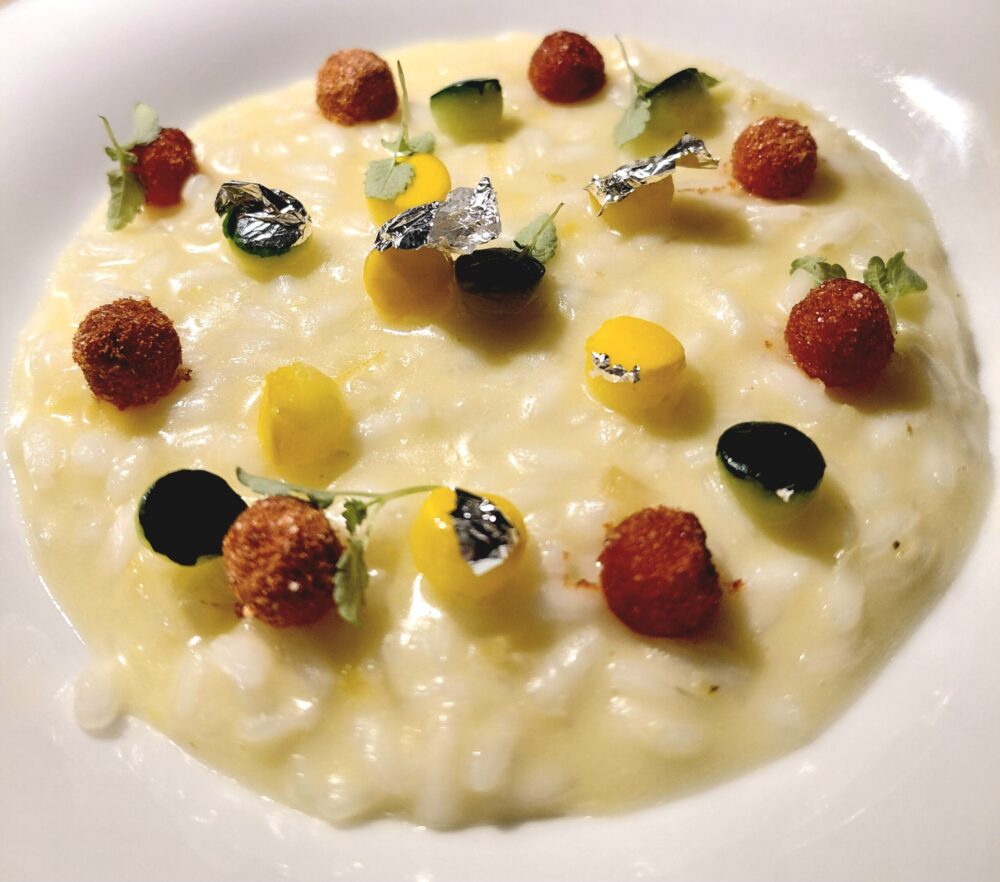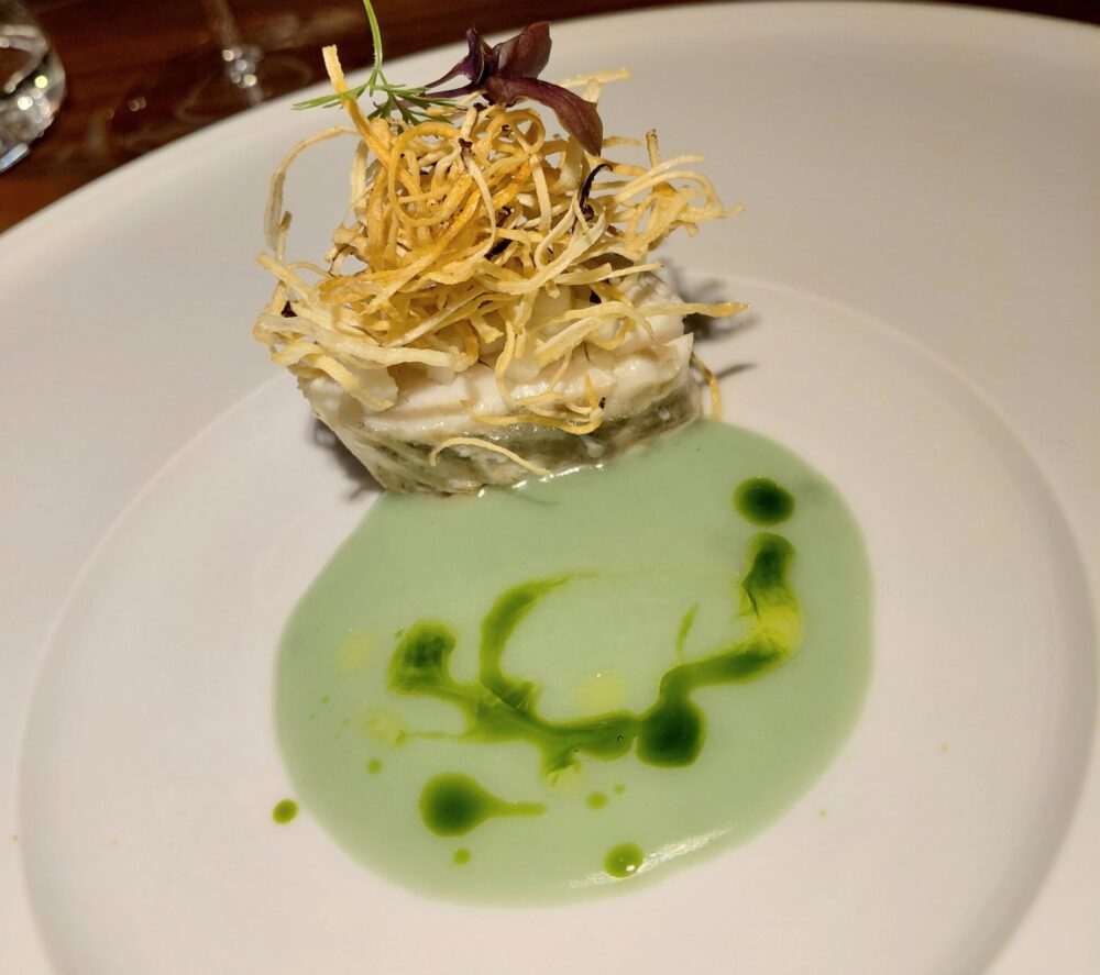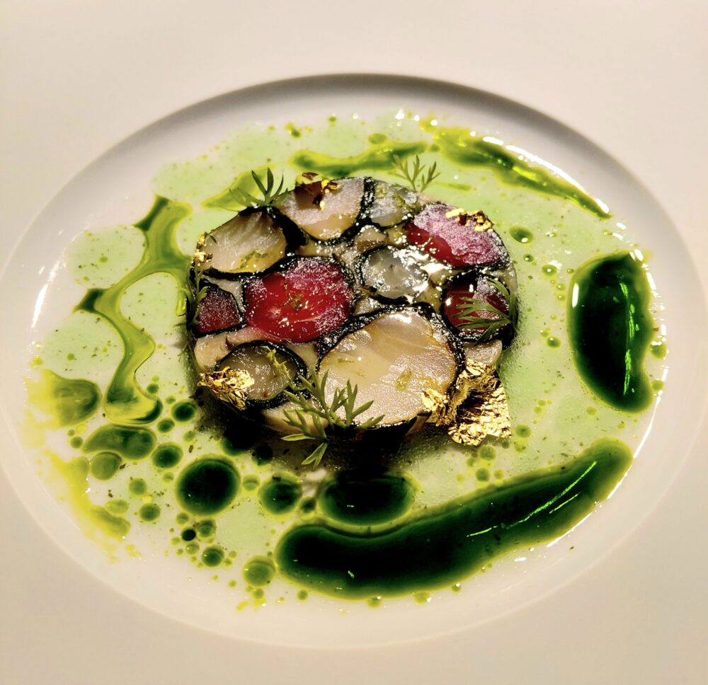 Un “non” che diventa “oltre”: oltre il limite del glutine, oltre il semplice piacere, verso un’esperienza che accarezza i sensi e celebra la materia prima nella sua forma più pura. Il menu in degustazione proposto si è dimostrato difatti un vero e proprio tassello di alta cucina. Tra abbinamenti vinicoli da manuale e un filo rosso che lega mare e terra, tradizione e visione, leggerezza e potenza si è potuto infatti assistere ad un vero concerto di colori e sapori. L’inizio è di appannaggio di una “insalata di mare”, un elegante dialogo tra freddo e caldo: un mosaico di pesci marinati circondato da oli verdi incontra una delicata zuppetta di patate e molluschi, in perfetto equilibrio tra freschezza e comfort.