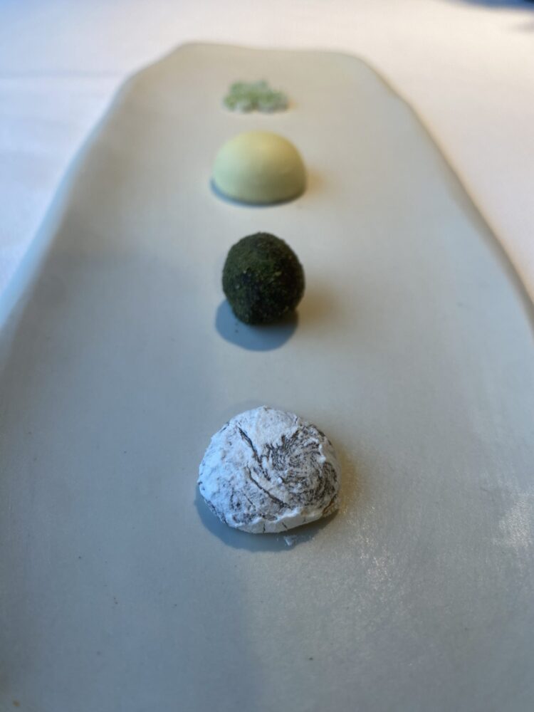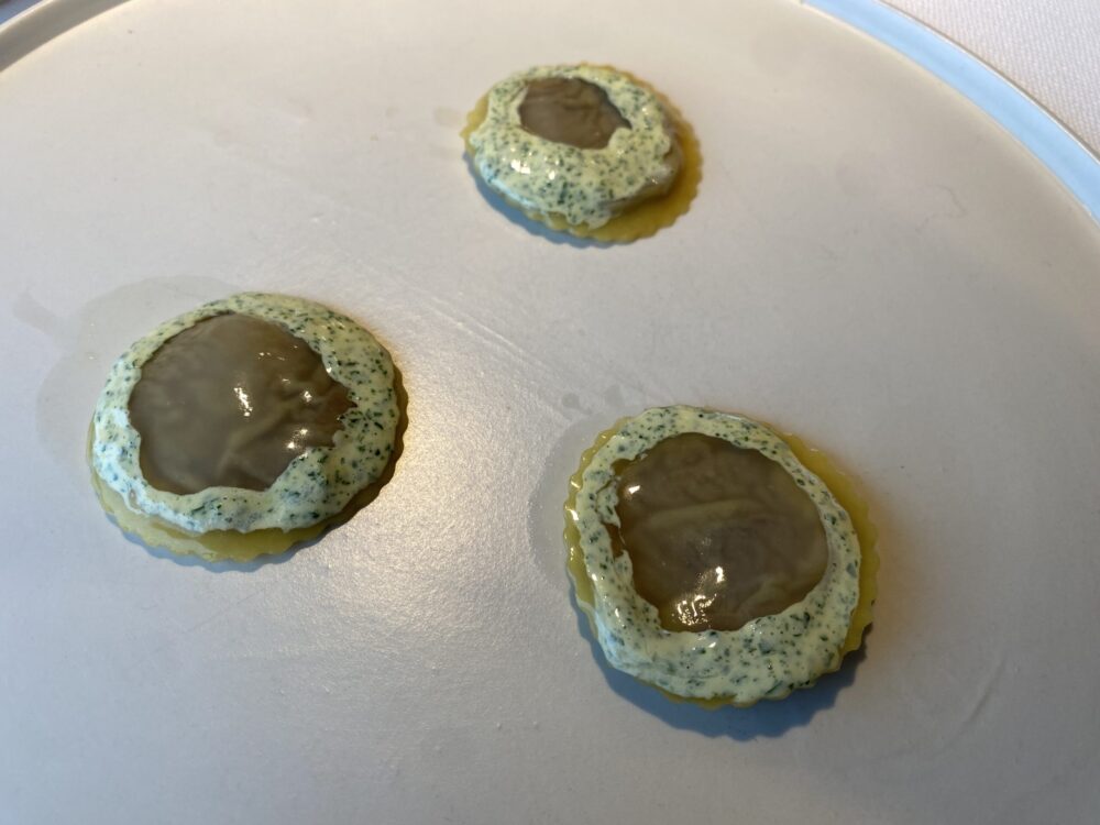 Vegetale puro in topinambur, olive e castagne; e Adriatico tra Duino e Puglia nella cozza con basilico e parmigiano.
