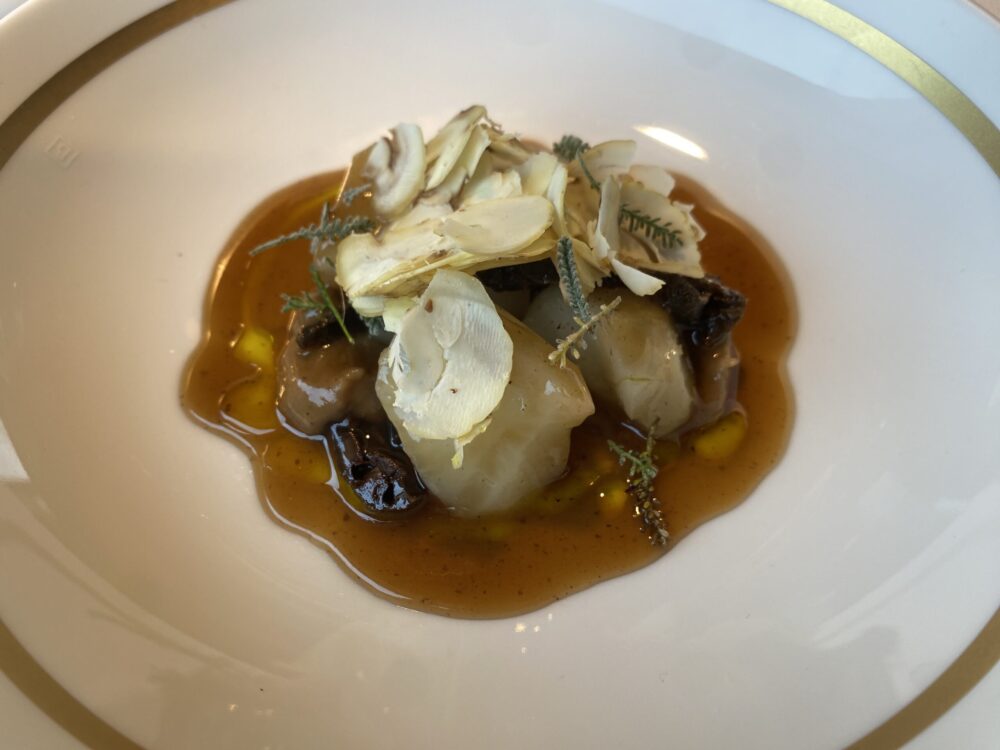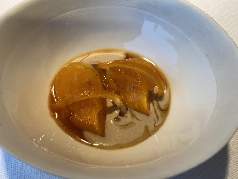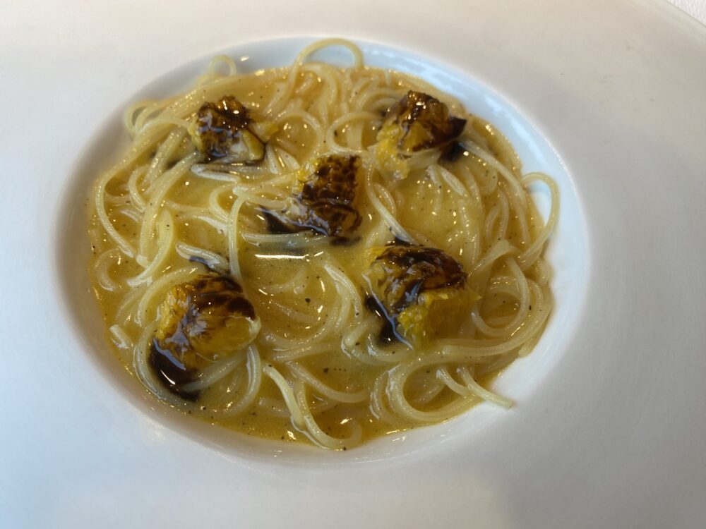 Due piatti clamorosi a seguire: capellini al mandarino e rosmarino, e ravioli ripieni di bollito di lingua con sambuco e maionese al dragoncello. Ovviamente diversi, eppure esplosivi, in una compiuta compenetrazione di sapori.