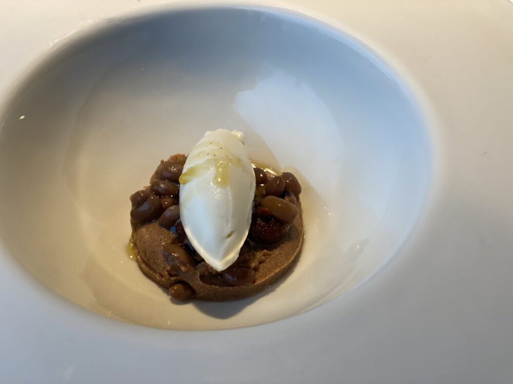 Per concludere, caco e noce e fagioli, carruba e nespola con gelato al rosmarino.