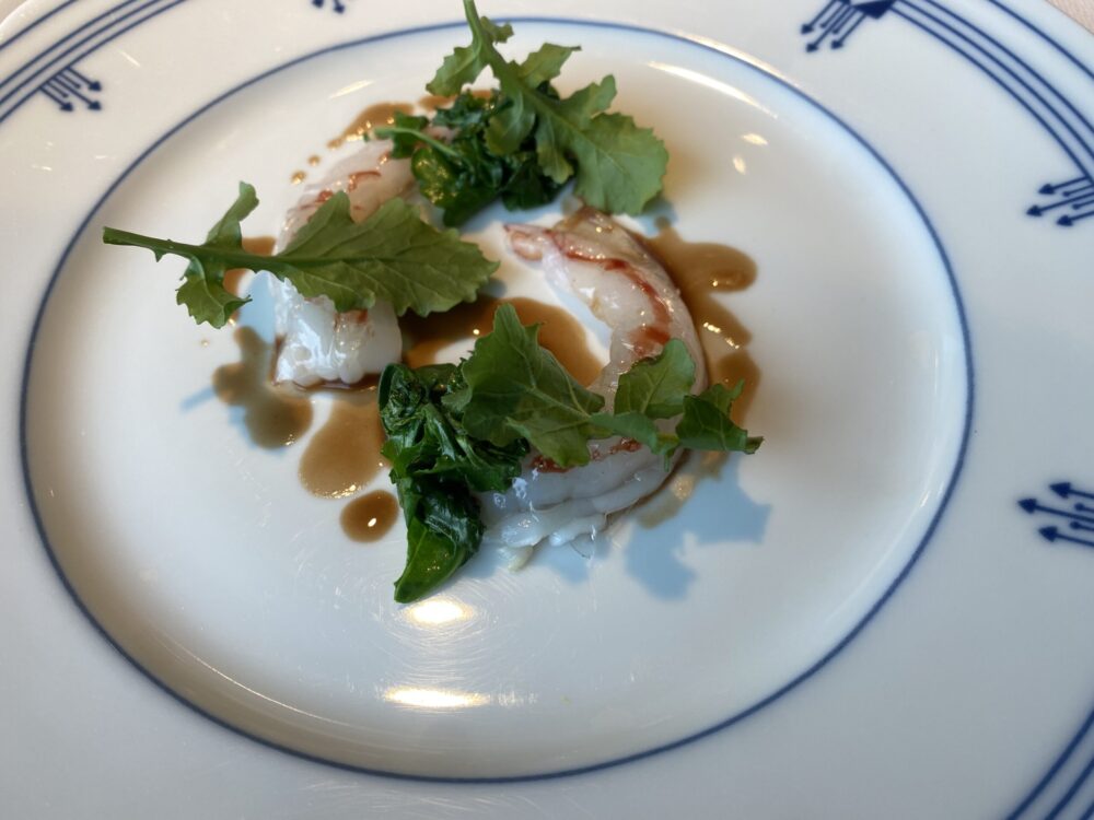 Mazzancolla con lardo e prugna, e si torna in pura Mitteleuropa con la garniture favorita per le carni applicata al crostaceo.