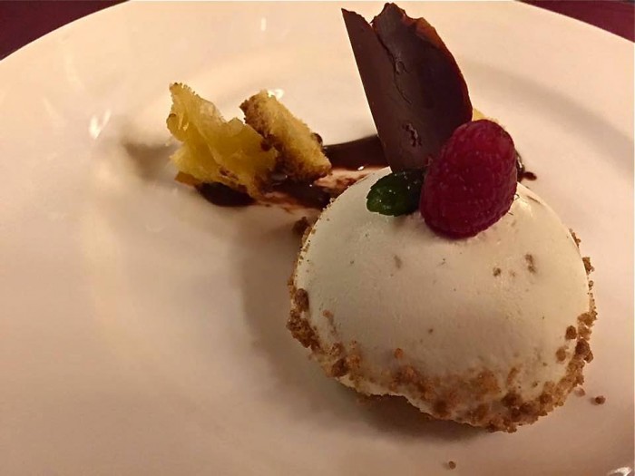 A chiudere, un delicatissimo dessert, “bianco mangiare” al torrone e panettone con salsa al cioccolato amaro.
